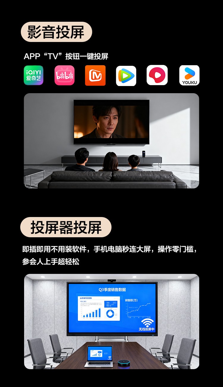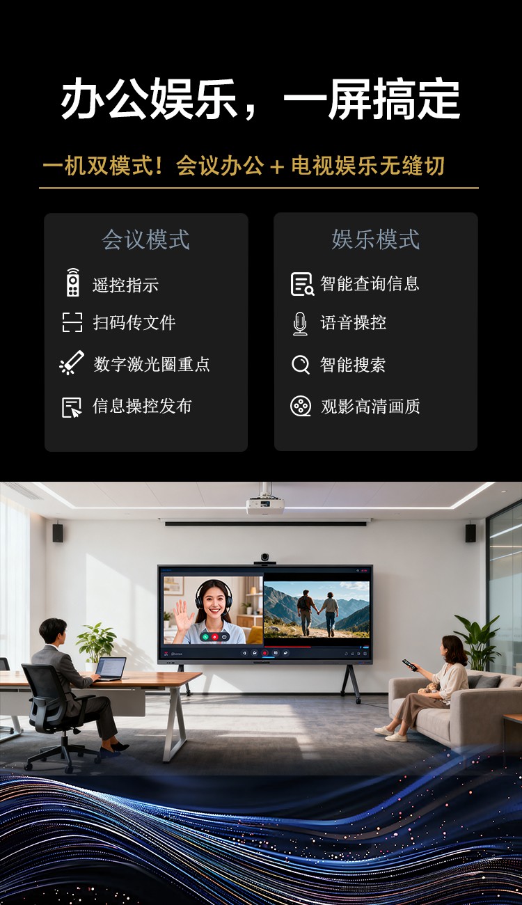 集电视、投影仪、电子白板、广告机、音响等多功能为一体具备远程视频会议、
